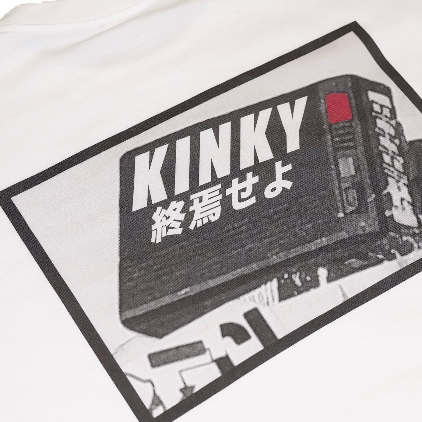左胸元に黒字でKINKY枠組みは灰色です。背後にはプリントを施しております。